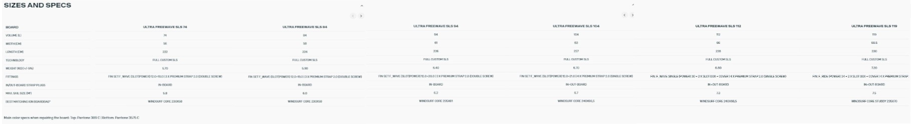 Duotone Ultra FreeWave è disponibile in 6 misure da 74, 84, 94, 104, 112 e 119 litri per i rider più pesanti e i venti più leggeri.